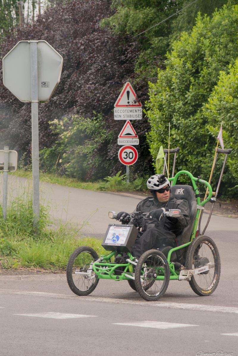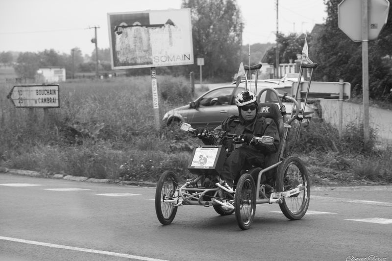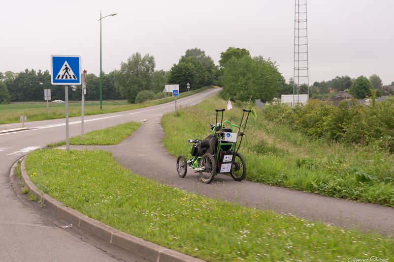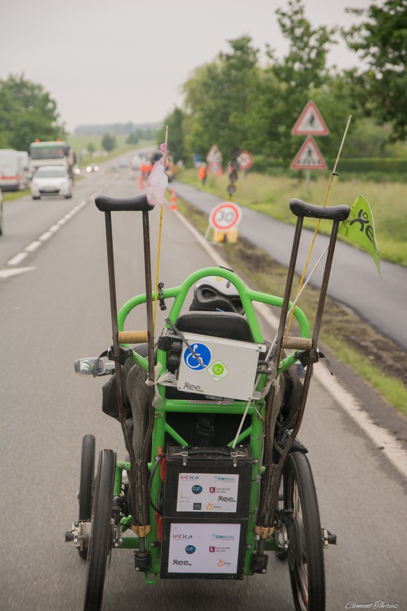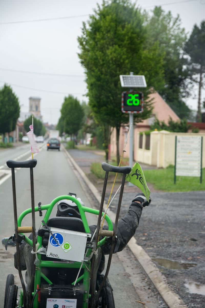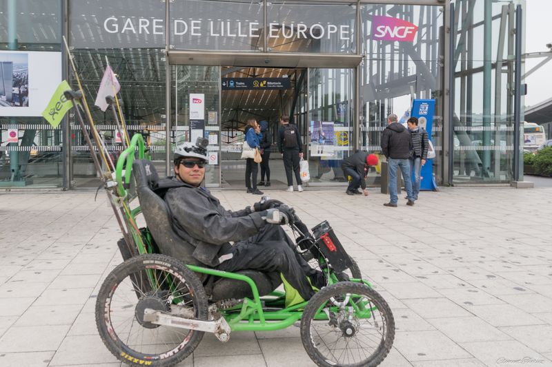 Ayant suivi lors de la dernière étape entre Valenciennes et Lille, Ibrahim, je vous livre quelques secrets qui on fait que son défi était rendu possible. Une étape qui se déroulait le plus possible sur les pistes cyclables avec un système de klaxon qui permettait de communiquer avec le véhicule d’accompagnement soit pour lui indiquer les directions qu’il devait prendre et bien entendu pour le protéger en cas de nécessité car il n’y avait pas toujours de pistes cyclables parfois il devait prendre des chemins de terres d’où l’utilité d’un équipement tout terrain et d’une combinaison étanche et imperméable. Il traversait parfois les routes nationales avec des travaux et des voitures ou camions qui roulaient vite.